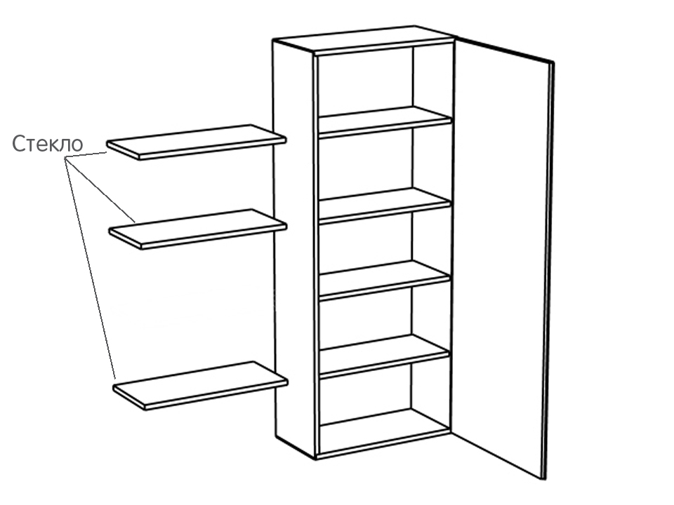 Шкаф с одним отделением за распашной дверью. Наполнение шкафа - четыре полки. В комплекте идут щитовая и стеклянная полки. Дверь открывается по принципу «нажал-открыл». Шкаф крепится к стене.